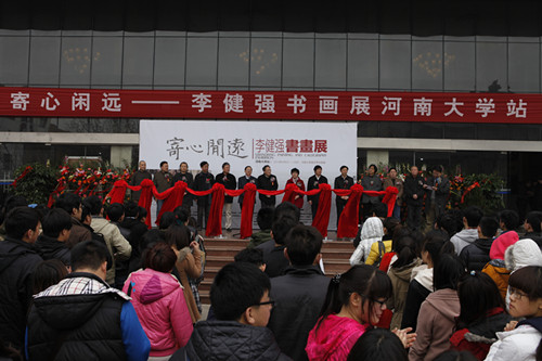 3月22日,春和景明,由河南省文化艺术界联合会、河南省文化厅、河南省美术家协会、河南省书法家协会、河南大学等单位联合主办,河南省书画院、河南大学艺术学院共同承办的“寄心闲远——李健强书画展”在我校艺术学院隆重开幕。开封市委组织部部长谢玉安,开封市人大副主任、省书协副主席王宝贵,河南大学党委副书记王凌,开封市政协副主席马同森,省美协顾问丁中一,省美协副主席王彦发、李明,省书协副主席、河南大学艺术学院院长赵振乾等出席了开幕式并剪彩。《大河报》、《开封日报》等新闻媒体及开封市美协、开封市书协和开封市画院许多书画家、文化学者、收藏家、广大艺术工作者及艺术学院师生400多人观看了展览。