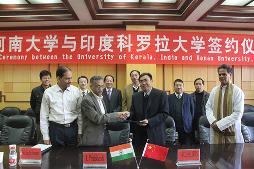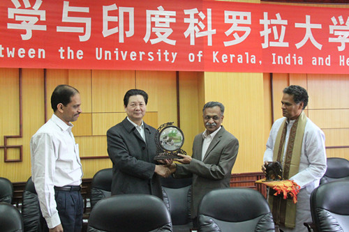 2013年3月20日上午,我校与印度科罗拉大学校际友好合作协议签约仪式在明伦校区行政楼二楼会议室举行。科罗拉大学常务副校长帕巴哈什教授、行政委员(财务主管)斯里•乔辛库玛博士、国际学术中心主任及计算生物与生物信息学院院长阿助桑卡•奈尔博士;我校校长娄源功、副校长宋纯鹏及国际交流处、研究生院、国际汉学院、欧亚国际学院、计算机与信息工程学院、生命科学学院等有关负责人参加了本次签约仪式。