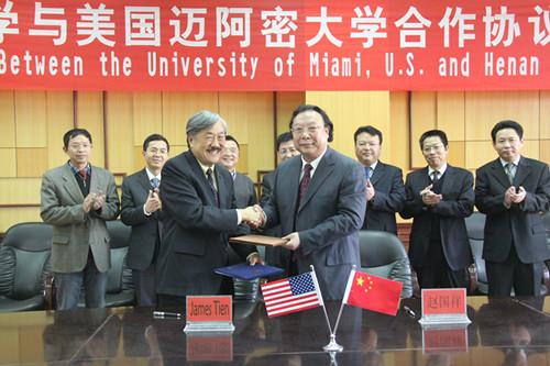 2013年3月4日上午,河南大学与美国迈阿密大学合作办学签约仪式在明伦校区新行政楼二楼会议室举行。美国工程院院士、迈阿密大学工程学院院长James Tien博士、佛罗里达教育管理中心白协伟先生,我校常务副校长赵国祥及国际交流处和有关学院负责人参加了此次签约仪式。