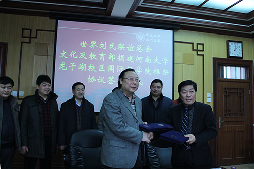 2012年12月29日上午,世界刘氏联谊总会文化及教育部捐资建设河南大学龙子湖校区国际汉学院框架协议签订仪式在明伦校区新办公楼二楼会议室举行,世界刘氏联谊总会文化及教育部部长刘增智,城乡小康发展河南中心主任王可栋,我校常务副校长赵国祥以及教育发展基金会、龙子湖校区建设融资与项目合作办公室、国际汉学院等部门负责同志出席仪式。仪式由龙子湖校区建设融资与项目合作办公室副主任王建军主持。