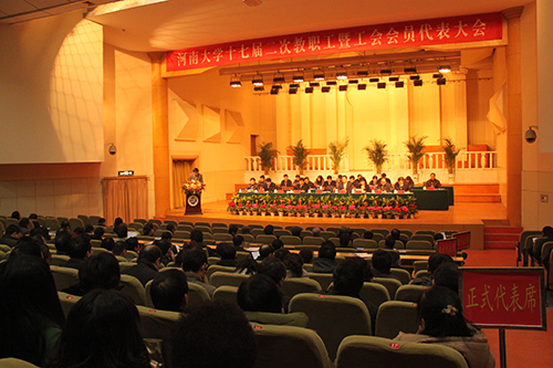 2012年12月22日,河南大学十七届二次教职工暨工会会员代表大会在艺术学院音乐厅隆重举行。全体代表(正式代表、列席代表、特邀代表)肩负全校教职工的重托与会。校领导关爱和、娄源功、梁晓夏、王凌、关学增、邢勇、刘志军、雷霆、朱恒宽等出席会议并在主席台前排就座。