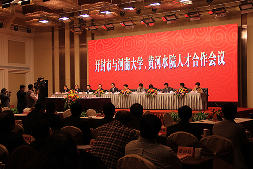 2012年11月28日下午,开封市与河南大学、黄河水院人才合作会议在开封中州国际花园酒店举行。开封市委书记祁金立,市委副书记蒋益民,市委常委、组织部部长谢玉安,市委常委、常务副市长黄道功,我校党委书记关爱和、校长娄源功、党委常务副书记梁晓夏,以及黄河水利职业技术学院、开封大学等驻汴高校、市属高校领导出席会议。会议由蒋益民主持。