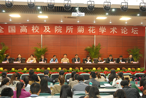 金秋时节,丹桂飘香,菊花怒放。2012年10月27日上午,由河南大学、开封市人民政府主办,河南大学生命科学学院、开封市园林菊花研究所承办的全国高校及科研院所菊花学术论坛在我校隆重开幕。来自北京林业大学、南京农业大学、华中农业大学、山东农业大学和北京市农业科学院等单位的50余位专家和代表参加了论坛。中共开封市委常委、开封市人民政府常务副市长黄道功,我校副校长宋纯鹏,北京林业大学教授、菊花研究专家戴思兰,华中农业大学教授、中国花文化研究会副会长王彩云,开封市科技局副局长程燕,开封市菊花协会会长、园林菊花研究所所长徐颂文,我校科研处、生命科学学院相关负责人等参加了开幕式并在主席台就座。开幕式由我校生命科学学院党委书记高如民主持。