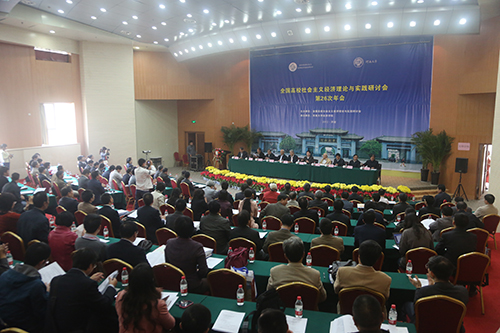 八方荟萃百年学府河南大学,四海学人探讨经世济民大计。2012年10月27日上午,由我校承办的“全国高校社会主义经济理论与实践研讨会”第26次年会隆重开幕。教育部社会科学司司长杨光,河南省人民政府政策研究室主任王永苏,我校党委书记关爱和,“全国高校社会主义经济理论与实践研讨会”领导组组长、南京大学党委书记洪银兴,秘书长、辽宁大学校长黄泰岩,我国著名经济学家卫兴华、吴宣恭、逄锦聚、林岗、李晓西在主席台就坐。来自北京大学、清华大学、中国人民大学、南京大学、南开大学、复旦大学、西南财经大学、吉林大学、武汉大学、厦门大学、中南财经政法大学、北京师范大学、辽宁大学、中央党校以及河南大学等80多所高校的220余位专家、学者参加了大会。开幕式由我校经济学院院长耿明斋主持。