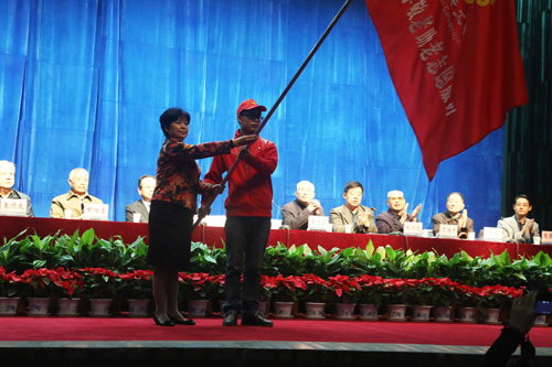 校团委书记张国强宣读我校志愿服务队名录。王凌为助老志愿服务队授旗。志愿服务队代表杜慧哲、离退休职工代表83岁的马佩教授分别发言。