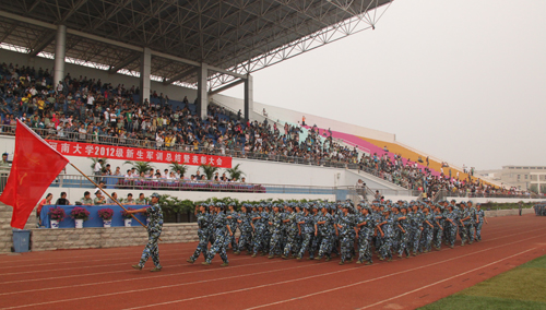 9月19日下午,我校2012级新生军训总结暨表彰大会在我校金明校区志义体育场隆重举行。中国人民解放军信息工程大学副政委高小燕少将、训练部副部长唐三林大校,开封军分区副政委王旭大校,校领导梁晓夏、关学增、邢勇、刘志军、雷霆,以及河南大学军训领导组成员出席会议。大会由副校长关学增主持。