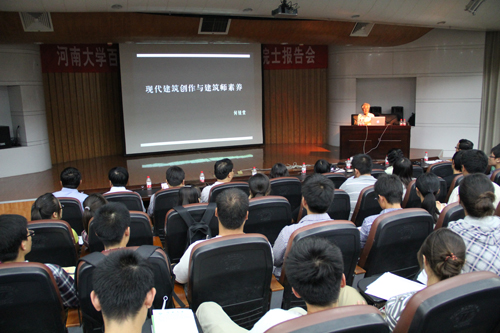何镜堂院士以我校典型建筑南大门、大礼堂作为切入点,表示百年河大具有优良的文化传统,河大建筑经得起时代的推敲。他指出,传承与创新是文化发展的基本点,和谐观是中国建筑文化的核心,并强调在建筑设计中要吸收传统精华,增强原创能力,建造出中国特色与时代精神兼具的建筑。