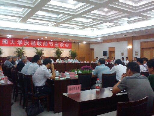 2012年9月10日下午,我校在明伦校区新行政楼第四会议室举行庆祝教师节座谈会。校领导关爱和、梁晓夏、赵国祥、王凌、宋纯鹏、关学增、邢勇、雷霆、朱恒宽,学校离退休老领导、老干部代表,高层次人才代表,民主党派、台侨联代表,学校各单位主要负责人以及教师和学生代表出席会议。大家欢聚一堂,共同庆祝第28个教师节,总结上一学年以来学校取得的成绩和百年校庆筹备工作的开展情况。