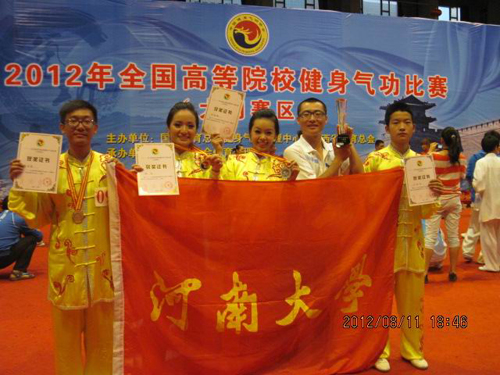 由我校体育学院武术系学生组成的河南大学健身气功队,在主教练贾亮老师的带领下经过激烈角逐获得易筋经集体赛一等奖,杨光同学获得六字诀女子个人赛(竞赛功法)第一名;此外,何晓琳获得易筋经女子个人赛(竞赛功法)第二名,马若晨获得五禽戏男子个人赛第三名,卢金亮获八段锦男子个人赛(竞赛功法)第五名。