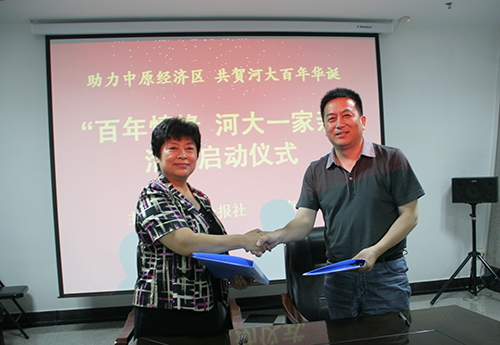 2012年7月27日上午,“助推中原经济区 共贺河大百年华诞”“百年情缘——河大一家亲”活动启动仪式在郑州中原福塔三楼会议室举行。我校党委副书记王凌出席,河南省新闻办副主任赵钢、省委宣传部新闻处副处长陈锋、河南大学郑州校友会秘书长张放涛,东方今报社长赵国平、副社长孙茹、副总编曹亚瑟及报社相关人员参加了启动仪式。