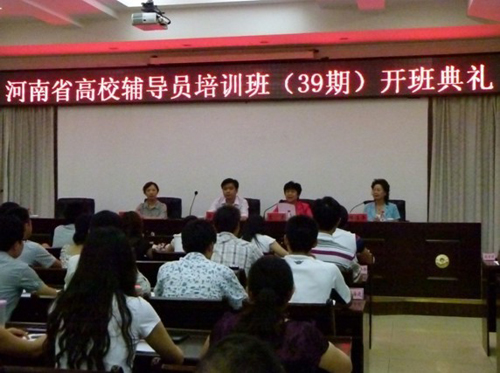 2012年7月9日上午,河南省高校辅导员培训班第三十九期开班典礼在我校金明校区干部培训中心举行。河南省教育厅思政处徐军保,我校党委副书记王凌出席典礼。典礼仪式由我校学工部部长周保平主持。