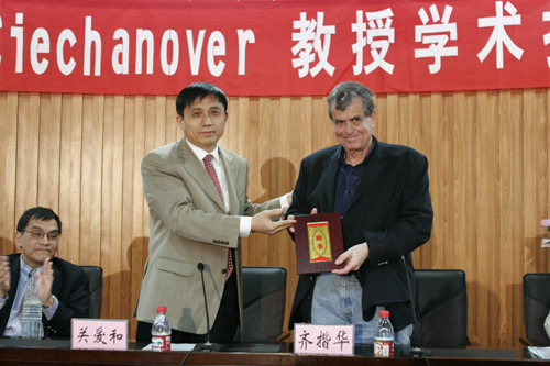 关爱和同志在欢迎辞中代表河南大学对阿龙•西查诺瓦教授的到来表示热烈的欢迎。他说,我们对邀请到阿龙•西查诺瓦教授来校讲学,并受聘担任我校名誉教授感到十分荣幸;希望我校的化学、生物与医学学科今后能有更多机会得到阿龙•西查诺瓦教授的指导和关心。我校愿意与阿龙•西查诺瓦教授为加强国际间的教育交流与合作共同努力。阿龙•西查诺瓦教授也发表了情真意挚的讲话,他表示,受到河南大学领导、师生的礼遇自己深受感动。西查诺瓦教授说:“作为生长在以色列的犹太人,我此次前来开封,来到河南大学,既是学术上的交流合作,也是文化上的寻根之旅。我们每个人都有自己的历史根源。”他表示,世界上有不同的民族、国家和文化,但“科学无国界,我们从事研究是为了造福全人类。我相信科学是我们共同的语言。”