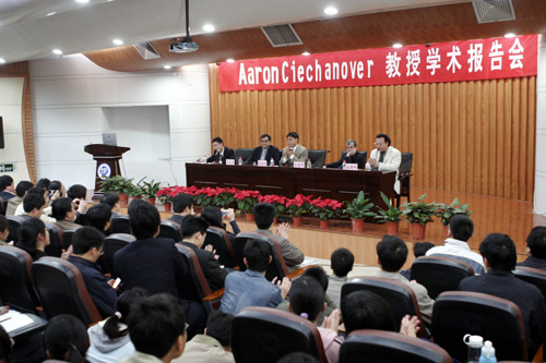 在题为“On the Dynamics of Our Proteins: From Basic Mechanisms and onto the Patient Bed(蛋白质动力学-从基本机制到人类疾病)”的学术报告中,阿龙•西查诺瓦教授完美地诠释了顶尖学者的大家风范和严谨认真的科学态度,他高屋建瓴地为师生讲解了细胞蛋白质降解过程的动因和意义,降解异常如何引起细胞功能的紊乱和疾病,以及通过调节蛋白质降解治疗癌症的前沿技术等问题。西查诺瓦教授介绍说,蛋白降解曾被认为是一非特异性的终止的过程而被忽视。而他们对泛素通路复杂级联反应的发现革新了这一领域。西查诺瓦教授发现,泛素控制的蛋白质降解不仅能够清除错误蛋白质,而且对细胞生长周期、DNA 复制以及染色体结构都有重要的调控作用。这一领域还有许多未解之谜等待后人破题。