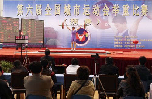 据悉,第六届全国城市运动会是北京奥运会前国内最重要的综合性运动会。在我校体育馆内进行的为期9天的举重比赛预赛结束后,每个级别总成绩获得前16名的运动员可以参加将于10月份在武汉举行的第六届全国城市运动会举重比赛决赛。
