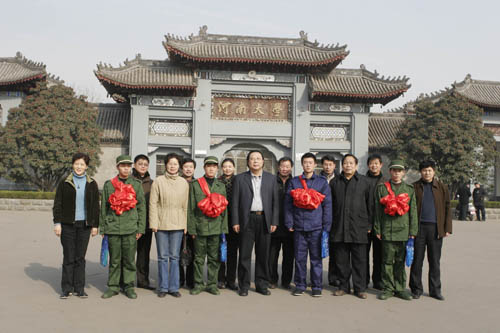 座谈会后,与会领导老师和四位新兵在河南大学门口留影纪念。