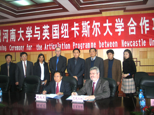 早在2003年,我校校长关爱和就代表我校与纽卡斯尔大学签署了校际合作备忘录,在此基础上,两校就联合培养学生,相互承认学分进行了磋商,2006年5月双方达成意向。目前,该项目已经过河南省教育厅批复。我校已经有48名学生经过选拔,加入该项目学习。