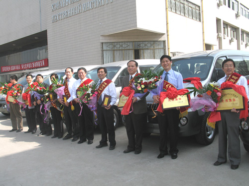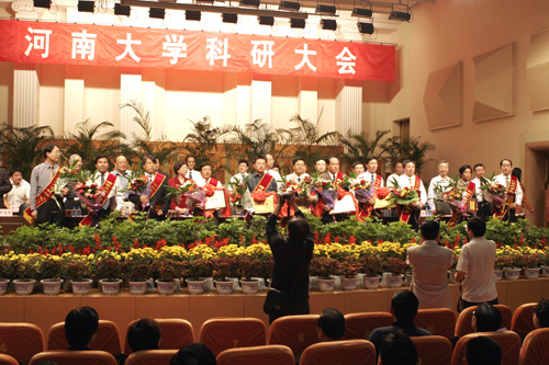 在副校长赵国祥宣读了《河南大学关于表彰“十五”期间为科研工作做出突出贡献的集体和个人的决定》后,特种功能材料重点实验室、植物逆境生物学重点实验室、黄河文明与可持续发展研究中心、体育改革与发展研究中心、环境与规划学院等五个先进集体的代表,宋纯鹏、李小建、耿明斋、张治军、杜祖亮、董学芝、王立群等七位先进个人走上主席台接受奖励。其中,先进集体各获得商务车一部,先进个人各获得一万元人民币的个人奖励。