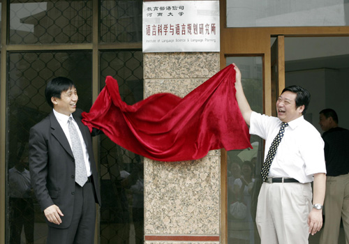 7月10日上午,由教育部语言文字信息管理司和我校共建的语言科学与语言规划研究所正式成立。在文学院办公楼前,校长关爱和与国家语言文字工作委员会副主任、教育部语言文字信息管理司司长李宇明一起为语言科学与语言规划研究所揭牌。