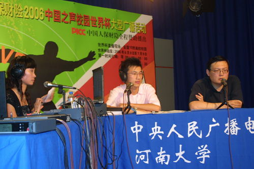 北京时间6月12日21时,新闻与传播学院播音与主持专业2004级刘雯同学与中央人民广播电台节目主持人青音、足球评论员梁宏达一起,在河南大学演播厅向全球直播了2006年世界杯足球赛F组首轮澳大利亚队同日本的赛事。