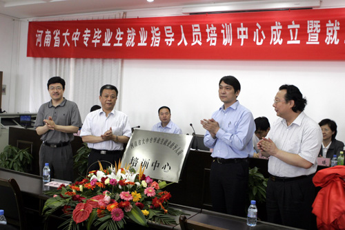 5月23日上午,河南省大中专毕业生就业指导人员培训中心成立暨就业指导工作研讨班开班典礼在河南大学干部培训中心隆重举行。典礼由省教育厅学生处处长石品主持。省就业中心副主任吕冰宣读了《河南省教育厅关于在河南大学设立河南省大中专毕业生就业指导人员培训中心的通知》,全国大学生就业指导服务与信息咨询中心办公室主任国乐,中共河南省委高校工委副书记、省教育厅副厅长訾新建,我校党委副书记郑邦山、副校长赵国祥共同为“河南省大中专毕业生就业指导人员培训中心”揭牌。