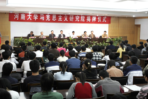 4月29日上午,新行政楼第四会议室,当中共中央编译局副局长王学东和省教育厅副厅长李文成共同揭起河南大学马克思主义研究院的牌匾时,全场响起了热烈掌声。河南大学马克思主义研究院的正式成立,标志着我校以及全省的马克思主义理论研究和建设工作新的起点和平台的形成。