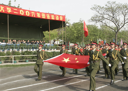 4月20日上午的明伦校区东操场彩旗招展,鼓声阵阵,2006年春季田径运动会开幕式在这里隆重举行。校领导张秉义、关爱和、王发曾、郭天榜、赵振海、袁顺友、黄亚彬、梁晓夏、孟庆琦等出席了开幕式。开幕式由校体委副主任姚树基主持。