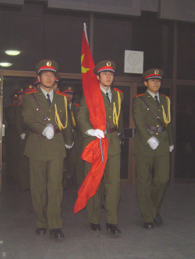 为了纪念七十年前轰轰烈烈的一二•九学生爱国运动,激励我校青年学子的爱国热忱。12月9日早晨,在大礼堂广场,我校国旗班迎着喷薄而出的朝阳,与500余名师生一起举行了隆重的升国旗仪式。