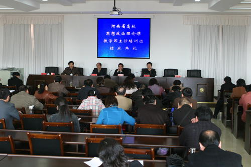 11月25日上午,全省高校思想政治理论课教学部主任培训班结业典礼在我校培训中心501会议室隆重举行,省高校工委社政处处长陈垠亭、办公室主任张延华,校领导郑邦山、孟庆琦以及校党委宣传部、马列德育部的有关负责同志出席,典礼由孟庆琦同志主持。