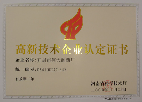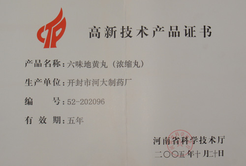 2005年10月20日,药厂经省科技厅评审委员会专家评审并经省科技厅审核,被河南省科学技术厅认定为高新技术企业,药厂生产的六味地黄丸(浓缩丸)被认定为高新技术产品。这标志着药厂生产产品的技术水平已达到国内先进水平,产品技术更为成熟,为进一步拓宽市场,提高市场竞争力提供了助力,并提高了企业的知名度。