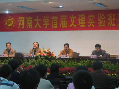 赵国祥同志在开学典礼上讲话,他首先向我校首届文理实验班的同学们表示祝贺,他说,河南大学经历了艰辛的发展历程,但是始终坚持走创新之路,走开放之路,取得了很好的效果。本次文理实验班将充分利用学校优势资源实现尽快培养优质人才的目标,是进一步提高教学质量、教学水平的重要举措,也是河南大学与国际接轨的一个重要探索。他希望首届的70位同学能够努力学习,全面发展打基础,培养特长谋发展,不辜负广大教职工生的厚望。