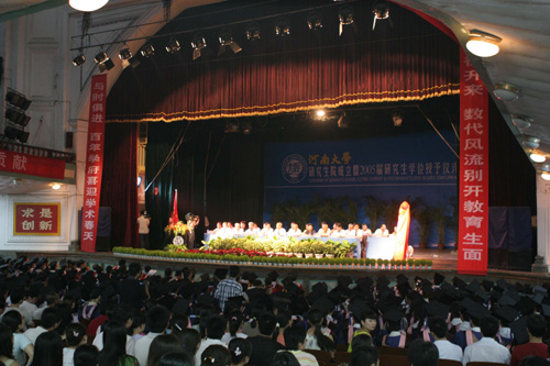 2005年7月1日上午,我校试办研究生院揭牌仪式在大礼堂隆重举行,河南省人民政府副省长贾连朝,中国社会科学院近代史所原所长、国务院学科评议组成员张海鹏,中国科学院研究生院副院长吕晓澎,中国社会科学院研究生院副院长崔健民,河南省教育厅副厅长李文成,我校全体在校领导以及原校领导李润田、王才安、王文金等出席揭牌仪式。贾连朝、李文成为河南大学研究生院揭牌。揭牌仪式由河南大学党委书记张秉义主持。