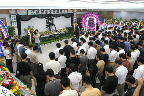 会场庄严肃穆,哀乐低旋。白底黑字横幅“沉痛悼念党鸿辛院士”悬挂在会场正上方,下面摆放的是鲜花、绿草簇拥中的党鸿辛院士的巨幅遗像。一幅上书“两弹一星元勋研精探微大业强华夏 千秋万代楷模教书育人英灵耀山河”的挽联概括了党鸿辛院士光辉灿烂的一生。党鸿辛院士的夫人黄萱荣率子女敬献的花圈及全国人民代表大会常务委员会敬献的花圈分别摆放在党鸿辛院士遗像两侧。会场两侧摆放着中国科学院,中共河南省委,河南省人大常委会,河南省人民政府,河南省政协,河南省军区,中共河南省纪律检查委员会,全国人大常委会副委员长、中国科学院院长路甬祥,中共河南省委书记、人大常委会主任徐光春,中共河南省委副书记、省长李成玉,中共河南省委副书记支树平,中共河南省委副书记王全书,中共河南省委副书记、省纪委书记李清林,中共河南省委副书记陈全国,河南省政协主席范钦臣,中共河南省委常委、宣传部长孔玉芳,中共河南省委常委、组织部长叶冬松,河南省人大常委会常务副主任李长铎,河南省人大常委会副主任李中央,河南省人民政府副省长贾连朝,河南省人民政府副省长王菊梅,中国工程院院士、河南大学学术委员会主任薛群基,中国科学院院士温诗铸、许友柏、邹广田、丁传贤、赵玉芬、霍裕平、吴养洁等敬献的花圈。