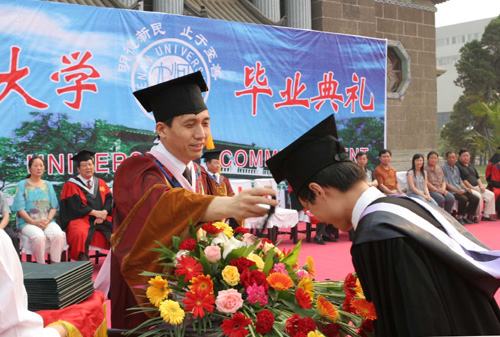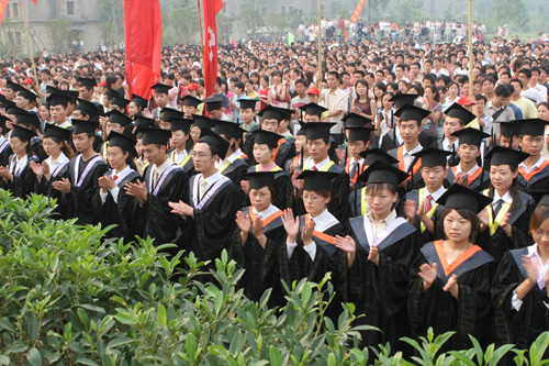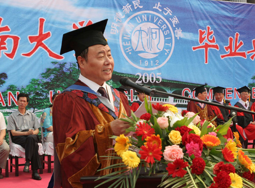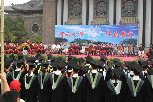 飞扬的青春,惜别的时节。沐浴着初夏曼妙的朝阳,来自我校各学院的五千余名毕业生聚集在明伦校区大礼堂前广场,河南大学2005年毕业典礼暨省级优秀毕业生学位授予仪式在此隆重举行。校领导张秉义、关爱和、郑邦山、王发曾、郭天榜、赵振海、袁顺友与各学院、各部门主要领导出席了毕业典礼。毕业典礼由副校长王发曾主持。