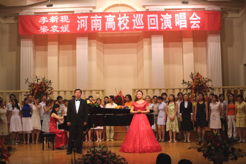 李新现先后跟随著名声乐教育家吕岱声、葛朝祉教授学习声乐,受到我国著名声乐教育家周小燕、石惟正教授的悉心教诲,因此,他的演唱朴实、真挚、自然、大方,声音抒情、优美,感情充沛,具有很强的艺术感染力。梁袁媛师从李新现,在歌唱方面有良好的天赋,演唱与众不同,有较强的艺术感染力。此次河南高校巡回演唱会旨在和兄弟院校的同行进行交流,以展示艺术学院的实力,展示我校的艺术教育水平。也借此来报答和感谢多年来在学业上给予帮助和支持的领导和老师们,