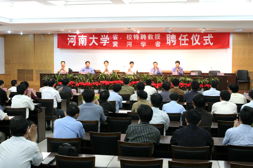 李文成副厅长和关爱和校长分别向省级特聘教授、黄河学者和校级特聘教授颁发了聘书。受聘人员代表、黄河学者邓锦波同志在发言时表示,一定会珍惜省教育厅和学校提供的机会,认真工作,刻苦钻研,为河南大学的进步和河南省高等教育事业的发展做出自己的贡献。