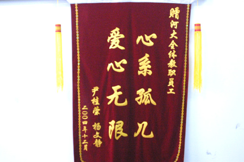 中午快下班时,这位老太太在一名男子的搀扶下来到校党委办公室,给我校送来了上书“心系孤儿,爱心无限”的锦旗。党办工作人员仔细询问后,才把事情的原委搞清楚。老人名叫尹桂荣,开封市人,是一位低保户。善良的尹桂荣老人收养了6名孤儿,原本生活就比较困难的她就更加拮据了,《汴梁晚报》对此事曾给予过报道。了解老人的情况后,很多好心人纷纷给她送钱送物,献上自己的一份爱心,也表达对老人善举的崇敬之情。近日,我校的几名教师也来到尹桂荣老人家,给她送去米、面、油等生活物品,临走时,还给老人留下了350元钱。老人询问他们的姓名时,他们却怎么也不肯说。无奈之下,老人只好定做了一面锦旗送到我校,表达对河大教师的感激之情。