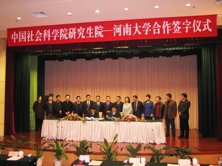 上午11点30分,中国社会科学院研究生院党委书记、副院长晋保平,河南大学校长关爱和分别代表各自学校在《中国社会科学院研究生院与河南大学关于联合建设河南大学研究生院的协议》上签下了自己的名字,在欢快的音乐声中,在众人热烈的掌声中,他们把手紧紧握在一起。协议的签订,这标志着两个学校合作的开始,必将对河南高等教育的发展起到极大的推动作用,必将为河大创建全国一流大学提供有力的支持和动力。