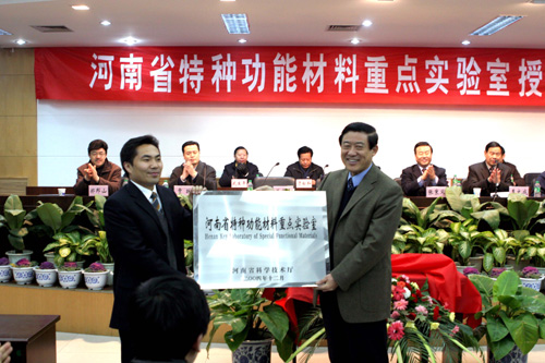 省科技厅副厅长贾跃主持授牌仪式。他首先宣布了省科技厅《关于批准河南省特种功能材料重点实验室正式开放运行的通知》。《通知》指出,按照豫科条[2001]55号文的批复要求,经过各方努力,由河南大学承担组建的河南省特种功能材料重点实验室基本完成了计划任务书规定的建设任务,于2004年12月22日顺利通过了省科技厅组织的验收,现批准正式开放运行。