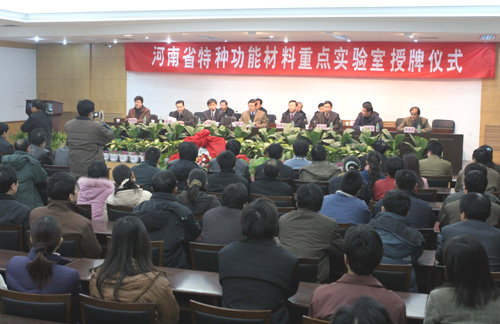 1月12日上午,河南省特种功能材料重点实验室授牌仪式在行政楼一楼会议室举行。河南省科技厅厅长姚聚川、副厅长贾跃,省教育厅副厅长李文成及校领导张秉义、关爱和、郑邦山、王发曾、黄亚彬出席了授牌仪式。
