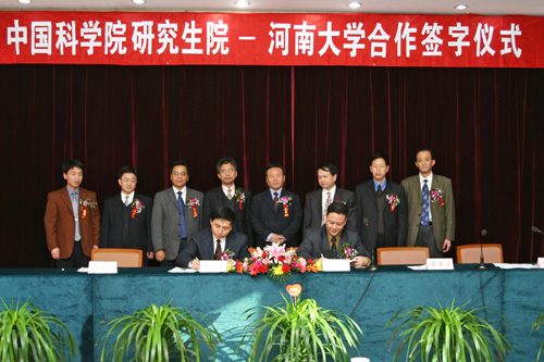 1月7日下午,中国科学院研究生院与河南大学合作协议签字仪式在中国科学院研究生院玉泉路园区举行。中科院研究生院党委书记、常务副院长邓勇、副院长马扬、副院长马石庄以及河南大学党委书记张秉义、校长关爱和、副书记赵豫林、副校长黄亚彬、副校长卢克平等参加了签字仪式。 邓勇同志与关爱和同志分别在协议书上签字。根据协议,双方将围绕河南大学研究生院的建设、高层次专门人才的培养等问题开展合作。包括:中国科学院研究生院将选派人员担任河南大学研究生院名誉院长或副院长、自然科学学位与研究生教育建设指导委员会委员、学位与研究生教育专家组成员、兼职博士生和硕士生导师;河南大学将推荐和选派优秀本科生、硕士生、博士生和青年教师到中国科学院研究生院深造;中国科学院研究生院将定期在河南大学举办研究生课程讲习班;双方将实行学位与研究生教育信息资源共享,相互开放有关网络资源、文献资源和实验室等。