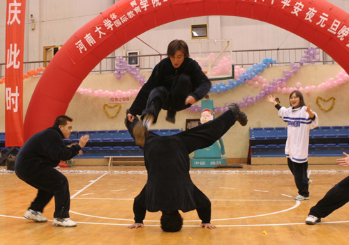 晚会现场和谐而热烈,处处洋溢着喜庆的气氛,演员精彩的表演和观众高涨的热情为留学生们献上了一份特别的圣诞礼物。晚会节目更是精彩纷呈,几名俄罗斯留学生表演的舞蹈《JETSET》和越南留学生宋海英演唱的《月亮代表我的心》,将异国风情带到了现场;而河大学子倾心演绎的健美操、武术、球技等节目也让在场留学生感受到了节日的问候与温馨。