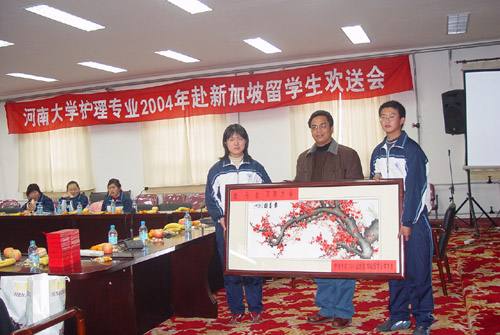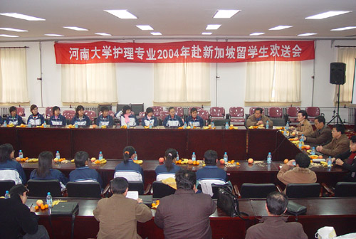 2004年12月15日下午,河南大学护理专业2004年赴新加坡留学生欢送会在六号楼三楼报告厅隆重举行。我校副校长卢克平、国际交流处副处长马骁勇及护理学院院领导出席会议。会议由护理学院党总支书记周新明主持。