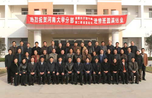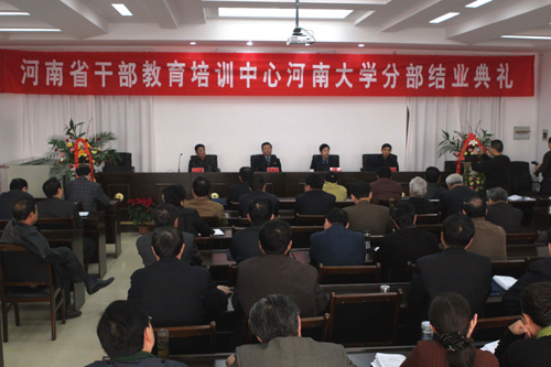 12月10日上午,河南大学首期市厅级干部进修班暨第二期省直处长进修班结业典礼在河南大学干部培训中心隆重举行。河南大学党委书记张秉义,党委副书记赵豫林,党委常委、副校长王发曾,党委常委、组织部部长史战芳等同志出席结业典礼。张秉义同志代表河南大学党委、行政作了重要讲话,省直处长进修班学员、省审计厅法制处处长卢周亭同志代表两个进修班全体学员发言。典礼由赵豫林同志主持。