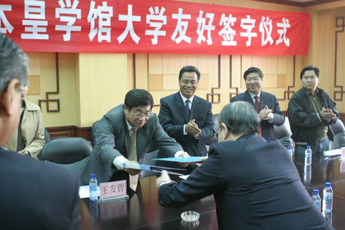 19日上午9时,王发曾副校长代表关爱和校长对客人的到来表示了热烈的欢迎,向客人介绍了学校的发展历史及现状,并对伊势市日中友好协会在建立起我校与皇学馆大学间友好关系方面所做的工作给予了高度的评价,对两校间的合作寄托了殷切的期望。在卢克平副校长的主持下,双方签署了《中国河南大学与日本皇学馆大学学术交流协议》,两校将于2005年9月开始正式启动双方间师生交换项目,该项目启动初期,交换名额暂定为每年2名,以后根据交流情况可增至4名,参加该项目的人员可享受接收方免除学费、研究费及住宿费的待遇。