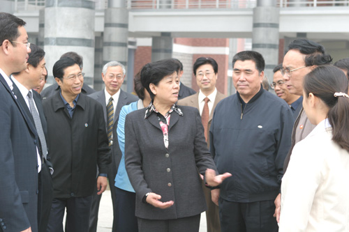 10月16日上午9:30,陈至立在河南省省长李成玉的陪同下莅临我校视察指导工作。在新校区,关爱和校长向陈至立一行简要汇报了我校的历史和现状,并具体介绍了我校在校生规模、师资等情况。郭天榜副校长具体介绍了我校新校区设计理念、建设进展以及新校区建成项目的使用情况。陈至立同志对我校新校区建设的整体工作表示肯定,认为我校新校区设计精美、布局合理、功能完备,与国外高校的建筑一样漂亮。