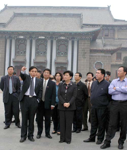 接着,陈至立详细地询问了我校学生的住宿及学费收费标准等情况,对我校坚持低标准收费给予高度评价。当听到关爱和同志说到目前我校在校生接近三万,到2010年在校生将达到四万人的规模时,陈至立同志关切地询问,目前河南大学的占地面积是否可以满足将来发展的需要?李成玉省长说道:目前,河南大学正在征地,拟在新校区附近再征用1600亩土地,以保证学校将来的发展。听到李成玉省长的解释,陈至立同志露出了满意的笑容。本来陈至立同志的工作日程安排得相当紧张,可是,当陈至立了解到我校悠久的办学历史的时候,仍流露出了浓厚的兴趣,表示要到老校区看一看。