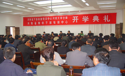 10月11日上午9时,省干部教育培训中心河南大学分部第一期市厅班、第二期省直处长班暨高校干部培训中心第十五期中青班开学典礼在我校金明校区干部培训中心隆重举行。省委组织部副厅级组织员宁建华,省委组织部干部教育处调研员田兰,省委高校工委、教育厅组干处熊光慈同志,我校校长关爱和、副校长王发曾,纪委书记赵振海,党委常委、组织部部长史战芳等同志及来自省内各地市的122名学员出席了开学典礼,典礼由赵振海同志主持。
