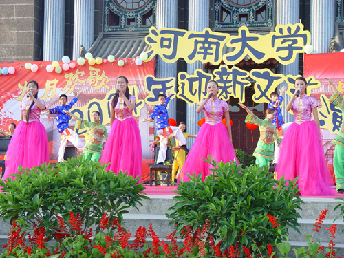 9月23日下午4时和24日上午9时,由校团委主办的“九月欢歌”河南大学2004年迎新文艺演出在校大礼堂前和金明校区先后拉开了帷幕。出席本次演出的有71320部队、开封市军分区、顺河区人武部的有关领导,我校党委书记张秉义,副校长、新生军训领导组组长赵国祥,副校长史全生及新生军训团领导组成员。我校2004级的全体同学观看了演出。