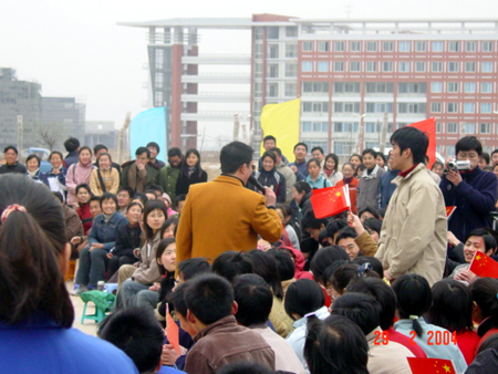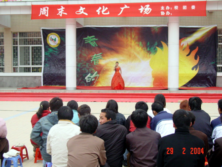 2004年2月29日,我校大学生艺术团的二十余名演员在校团委老师的带领下到新校区,为同学们送上了一份特别的春日礼物——第八十六期周末文化广场暨第十九届校园歌手汇报演出,这也是周末文化广场在新校区的首场演出。