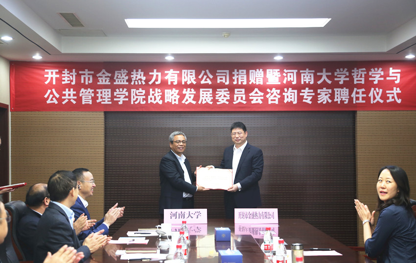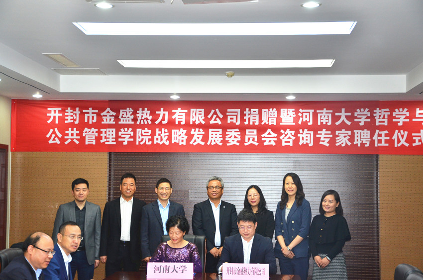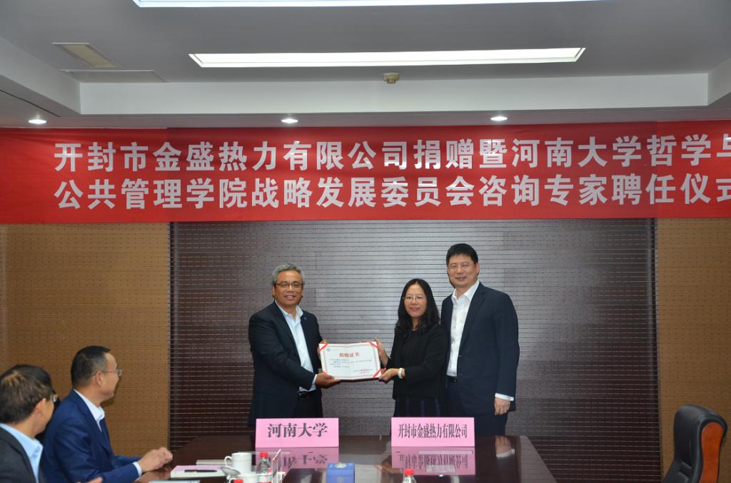 10月11日上午,开封市金盛热力有限公司捐赠暨河南大学哲学与公共管理学院战略发展委员会咨询专家聘任仪式在我校金明校区行政楼308会议室举行。开封市金盛热力有限公司董事长魏军委、副董事长梁静一行,校党委书记卢克平、校党委副书记雷霆出席仪式。校党委办公室、校友工作办公室与教育发展基金会、宣传部、人事处、学生处、财务处、哲学与公共管理学院相关负责人参加仪式。仪式由雷霆主持。